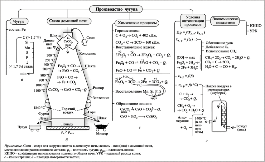 | Горн | 1400 ― 2000+ | Прямое восстановление FeO, плавление чугуна и шлака, образование угарного газа |
