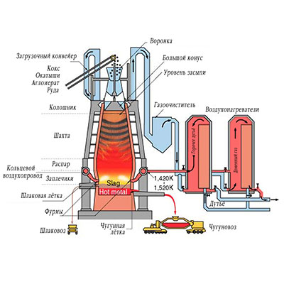 - Карбюризация: В нижней части печи, при высоких температурах, часть углерода из кокса и восстановительных газов растворяется в расплавленном железе, образуя чугун.